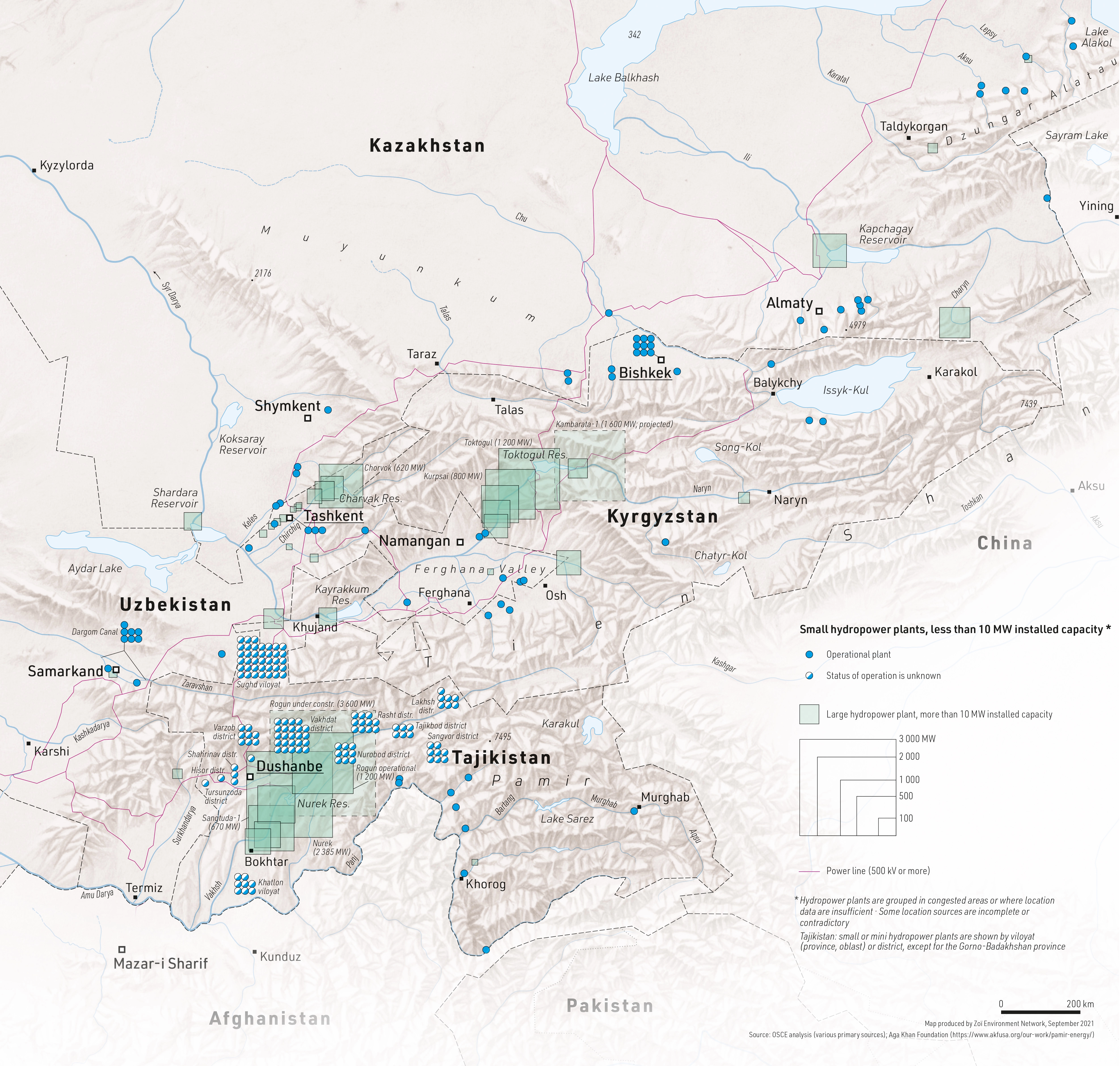 BeschreibungÜbersichtskarte der Wasserkraftwerke im grössten zusammenhängenden gebirgigen Teils von Zentralasien (Tienshan und Pamir in den Ländern Kirgisistan, Tadschikistan, Teilen von Usbekistan und Kasachstan).