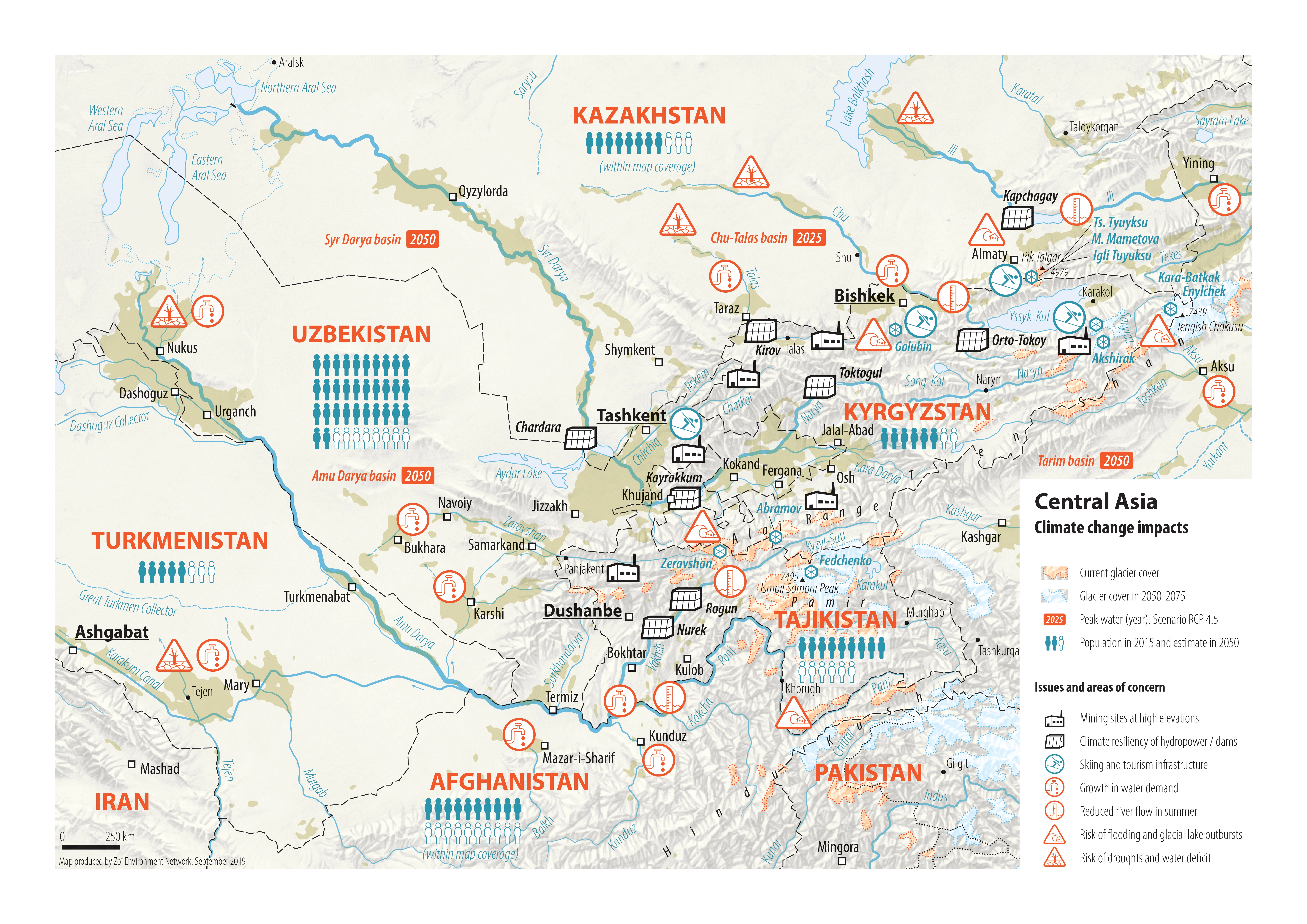 DescriptionMap of the potential impacts of climate change in the Aral Sea basin in Central Asia, with a time horizon until approximately 2050.