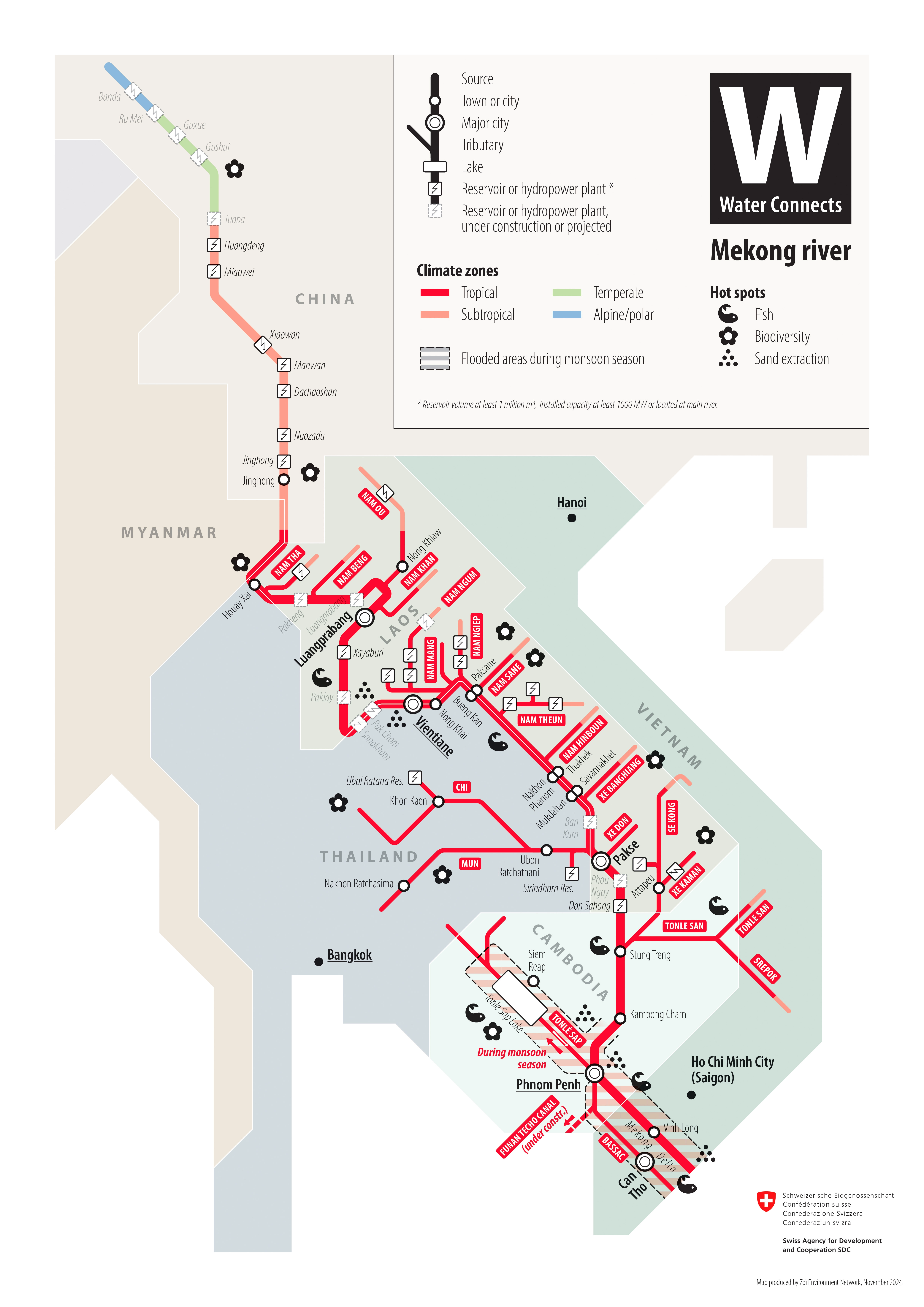 DescriptionA schematic representation of the Mekong catchment area. The most important tributaries, large dams and environmental hotspots are shown. The color of the river corresponds to the climate zone.