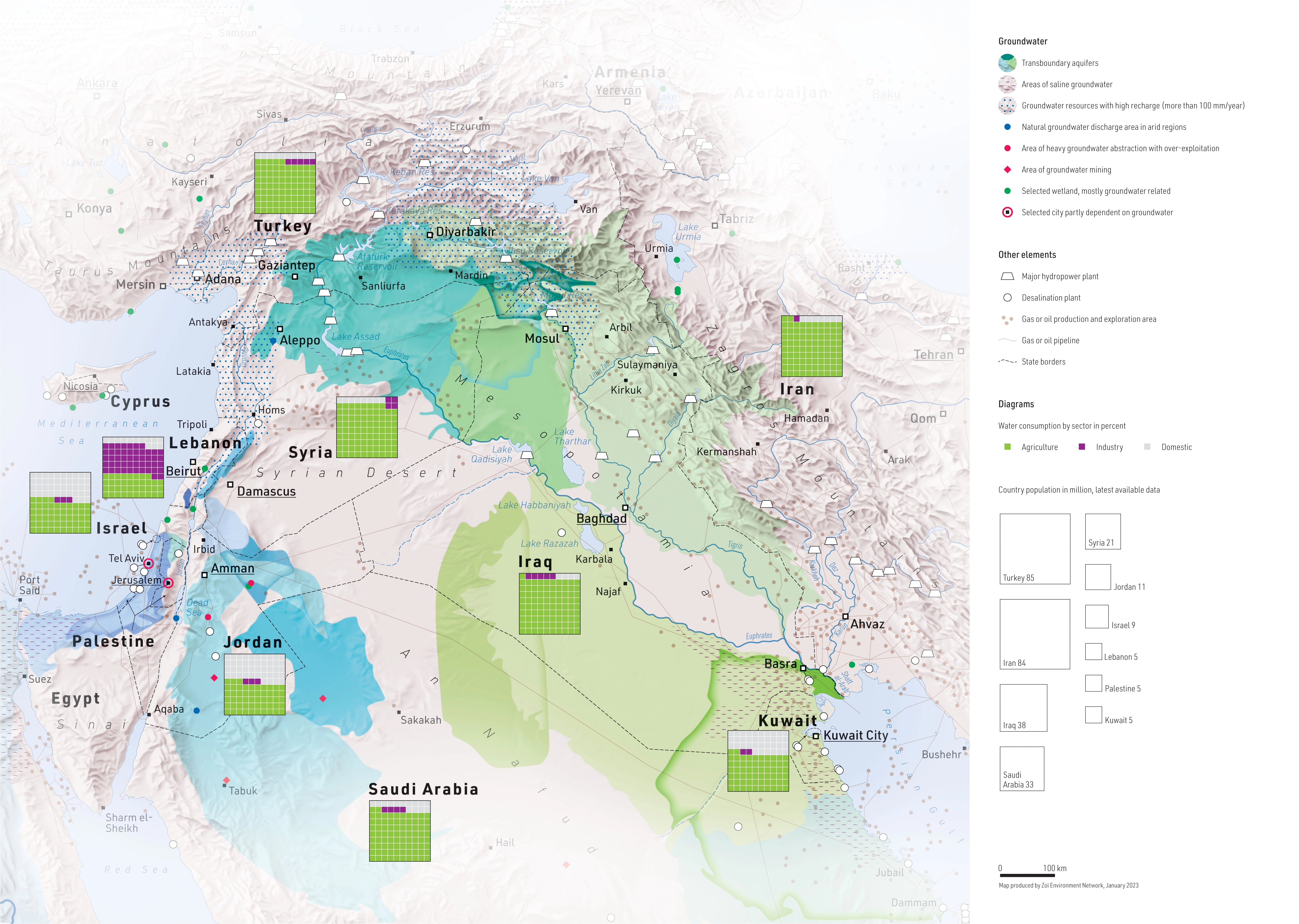 DescriptionWater consumption and location of transboundary aquifers in the Middle East. Other elements such as large hydropower plants, gas and oil production and various elements relating to population serve as context and round off the map. Variant of several similar maps.