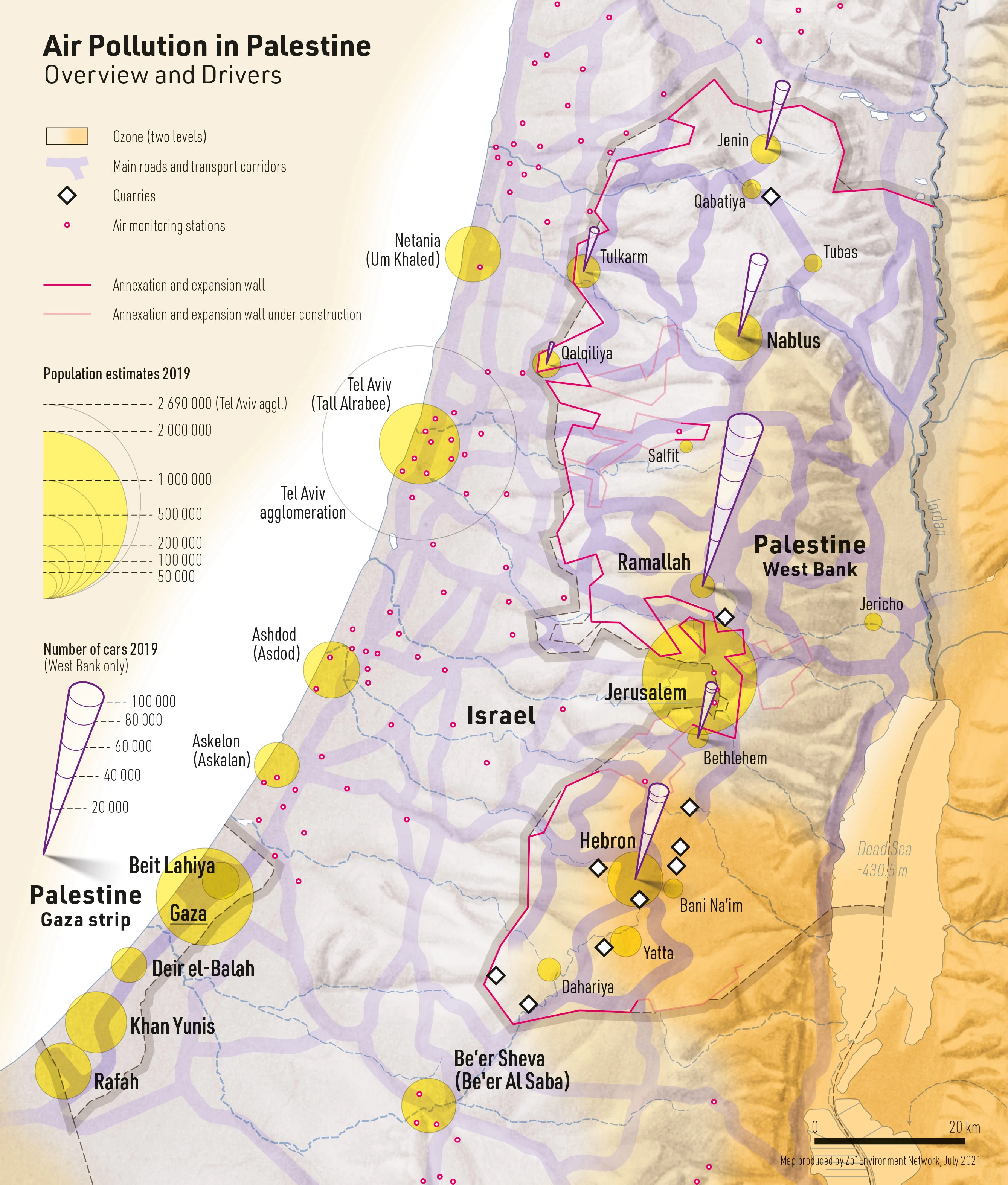 DescriptionMap of air pollution in Palestine. The map shows ozone pollution, air monitoring stations and, as drivers, main traffic routes, population centers (largest towns), number of cars and quarries.