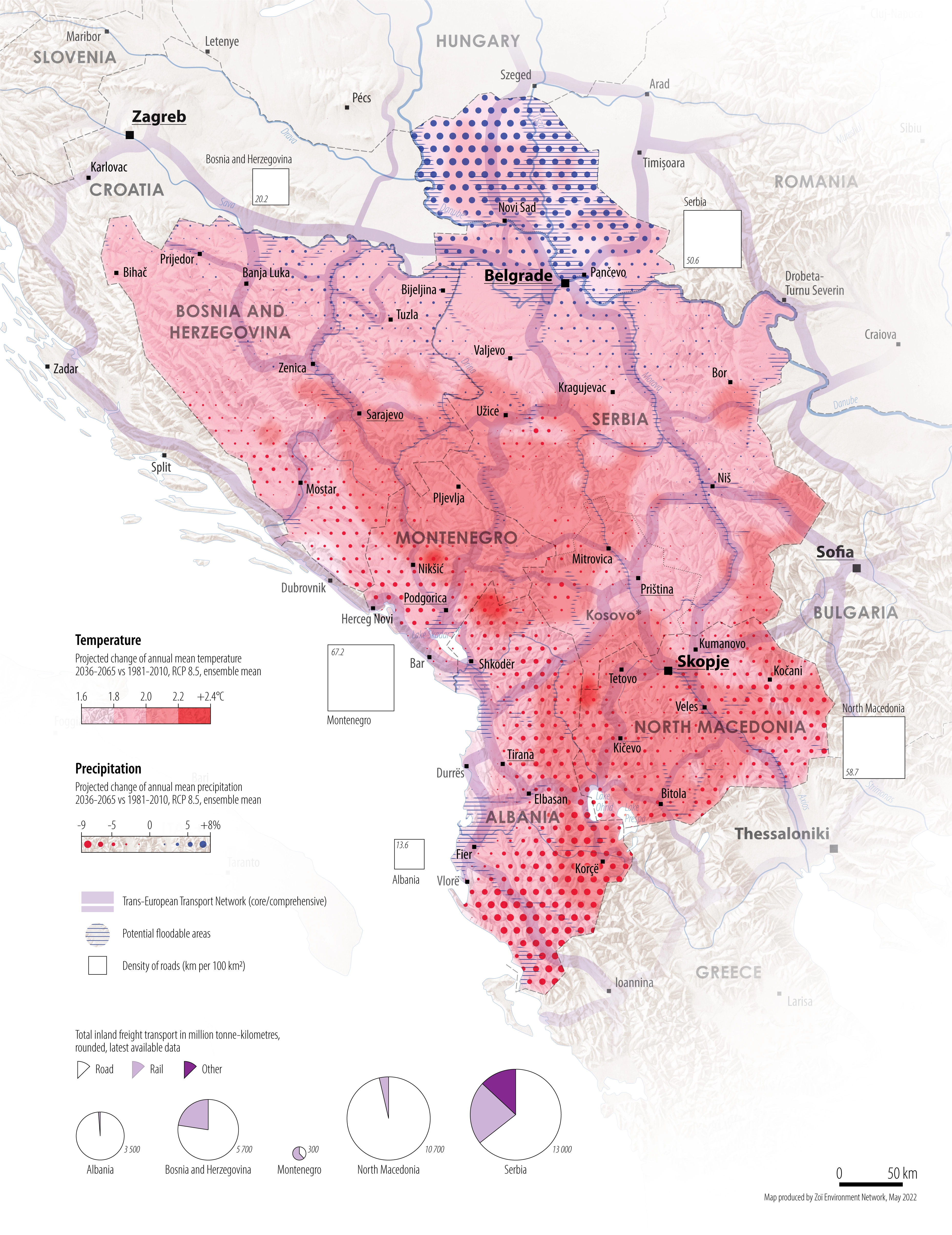 DescriptionOverview map of the Western Balkan countries Albania, Bosnia and Herzegovina, Montenegro, North Macedonia and Serbia on climate change in relation to the transportation network. The map is based on projected changes in temperature and precipitation. The most important transport corridors and information on the transport network in diagram form complete the content.
