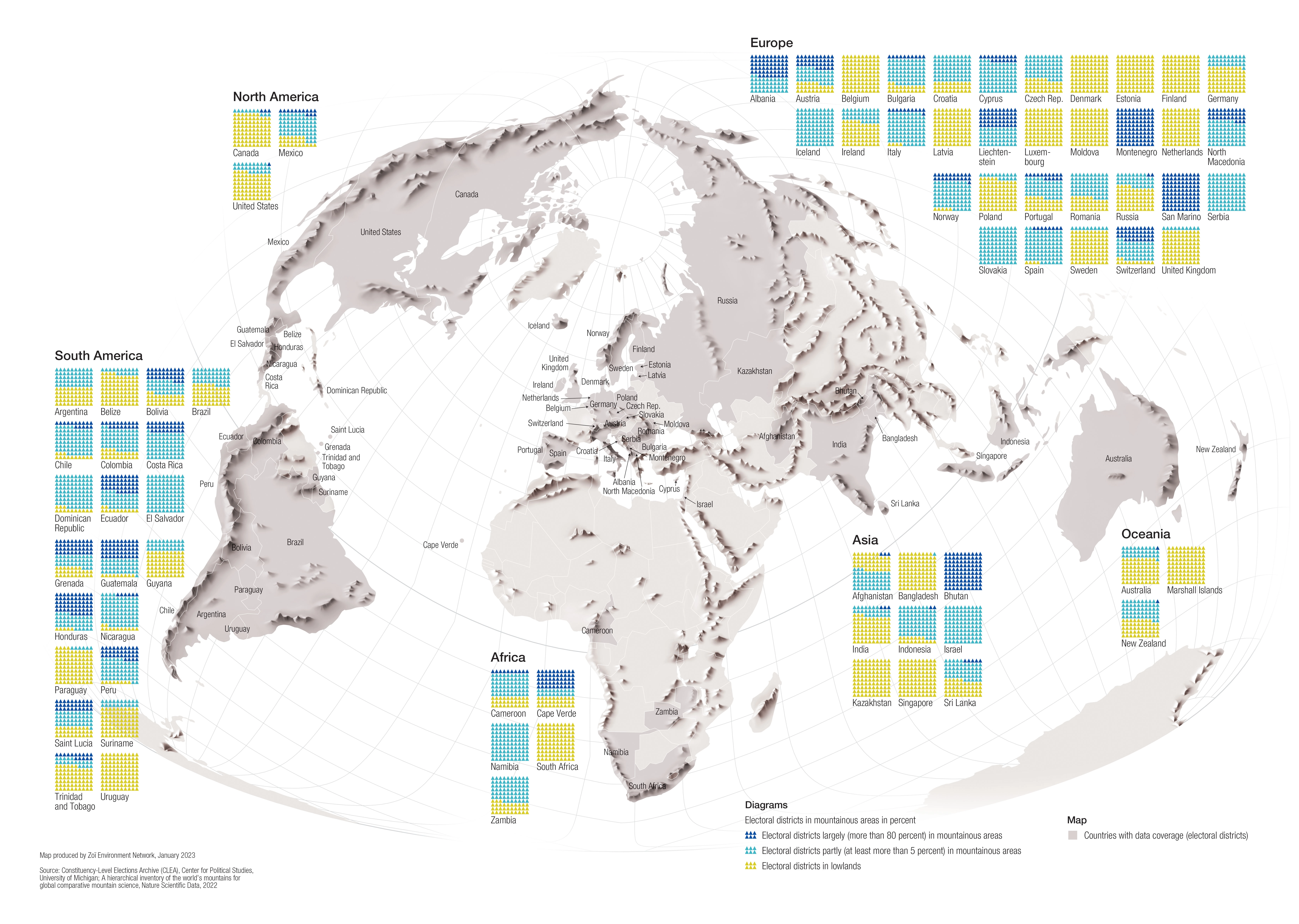 DescriptionWorld map of electoral districts in mountainous areas. The breakdown of electoral districts (in percent) located in mountainous areas is shown in diagrams.