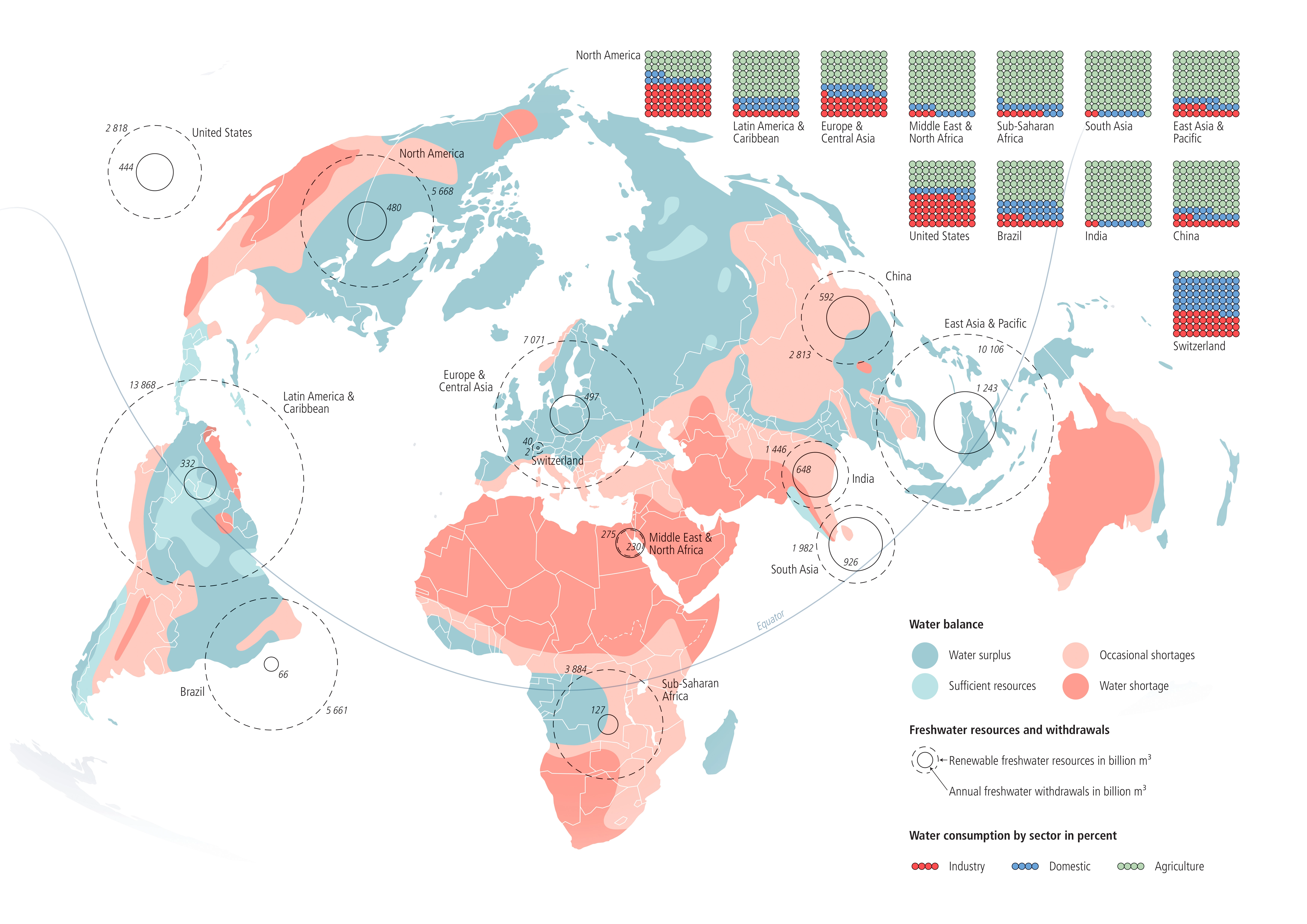 DescriptionWorld map of water consumption. The area coloring shows the water balance in four stages. Drinking water resources and withdrawals as well as water consumption in the industrial, domestic and agricultural sectors are shown in diagram form by continent.